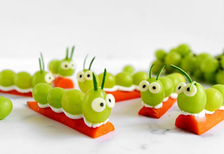 מסדרים את הענבים – לראש הזחל מניחים ענב עומד ולגוף ענבים שוכבים.